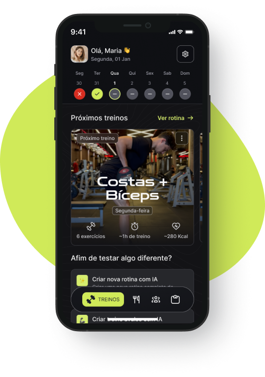 IA que conhece você: analisa seu objetivo, nível, equipamento disponível e monta treinos sob medida.
