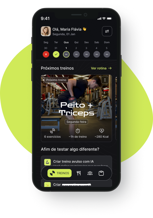 IA que conhece você: analisa seu objetivo, nível, equipamento disponível e monta treinos sob medida.